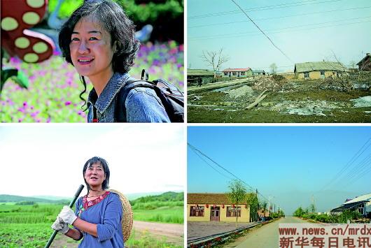 ▲左上圖為冷菊貞來小南河之前,是位漂亮的時(shí)尚女;左下圖為冷菊貞來小南河后干農(nóng)活,臉龐變得黝黑,成為一個(gè)“農(nóng)婦”(本報(bào)記者何山攝)。右上圖和右下圖為冷菊貞來小南河村前后村貌對(duì)比圖。(冷菊貞攝)