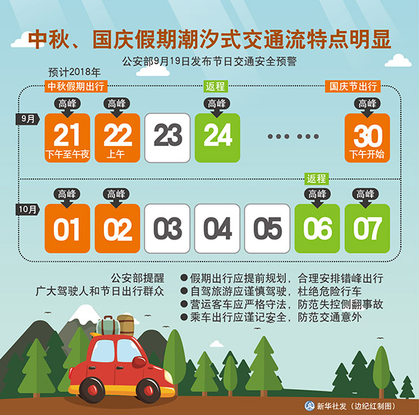 新華社北京9月19日電 公安部19日發(fā)布節(jié)日交通安全預警,今年中秋、國慶假期首尾將出現(xiàn)出行高峰,潮汐式交通流特點明顯。