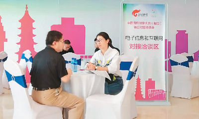 企業(yè)代表在接洽區(qū)進行溝通。主辦方為前來參會的企業(yè)專門設立了一個接洽區(qū),并按行業(yè)和領域進行區(qū)分。圖為電子信息和互聯網接洽區(qū)。企業(yè)代表可以通過服務臺查詢自己感興趣的企業(yè)聯系方式。