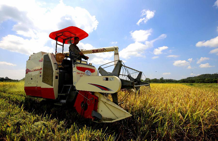 8月22日,江西省靖安縣仁首鎮(zhèn)石下村農(nóng)民駕駛農(nóng)機收割中稻。新華社發(fā)(徐仲庭 攝)