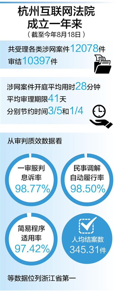 網(wǎng)上糾紛網(wǎng)上解,是設(shè)立互聯(lián)網(wǎng)法院的初衷之一。記者了解到,杭州互聯(lián)網(wǎng)法院發(fā)揮集中審理涉網(wǎng)案件的優(yōu)勢(shì),截至今年8月20日,共受理涉網(wǎng)案件12122件,審結(jié)10441件;發(fā)布電子商務(wù)審判、知識(shí)產(chǎn)權(quán)保護(hù)等白皮書3份,連續(xù)4次發(fā)布十大典型案例,進(jìn)一步強(qiáng)化了司法裁判的導(dǎo)向性作用。