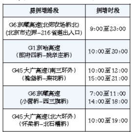 預(yù)計今早7點,G6京藏高速(小營橋-西三旗橋)將最早進入擁堵狀態(tài)。G6京藏高速(北郊農(nóng)場橋北) (北京市邊界-216省道出入口)從早9點進入擁堵狀態(tài),擁堵高峰將持續(xù)至23時。京哈高速在早10點進入擁堵狀態(tài),擁堵將持續(xù)至20時。
