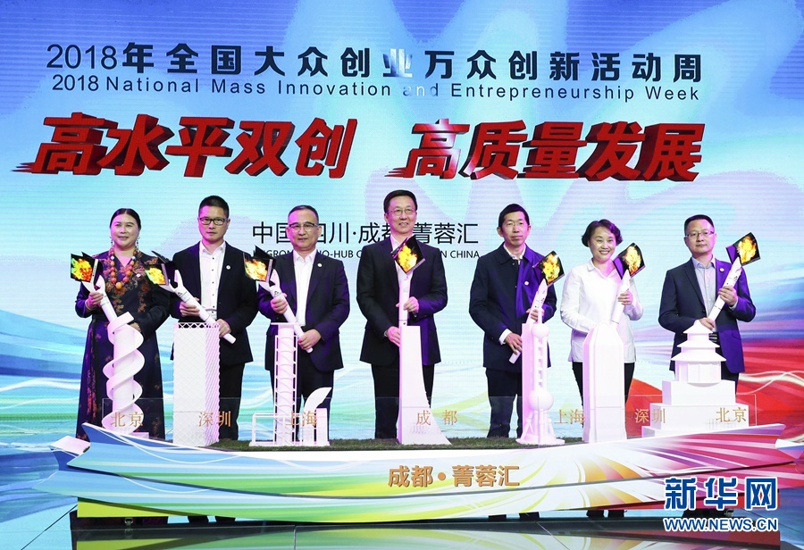 10月9日,2018年全國(guó)大眾創(chuàng)業(yè)萬眾創(chuàng)新活動(dòng)周在四川成都拉開帷幕。中共中央政治局常委、國(guó)務(wù)院副總理韓正出席啟動(dòng)儀式并講話。這是在啟動(dòng)儀式上,韓正與創(chuàng)新創(chuàng)業(yè)者代表共同啟動(dòng)活動(dòng)周。 新華社記者 龐興雷 攝