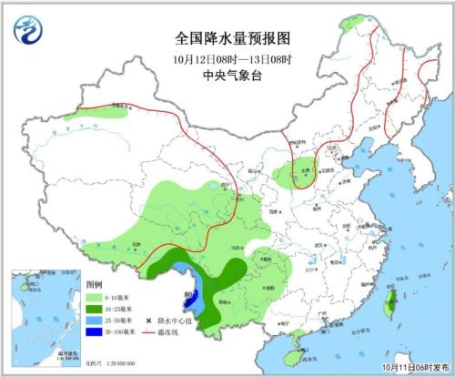10月12日08時至13日08時,青藏高原東部等地有小雨(雪)或雨夾雪;甘肅東部、陜西北部、山西中北部、西南地區(qū)大部、廣西西部、臺灣島和海南島等地部分地區(qū)有小到中雨,其中,西藏東南部和云南西部等地局地有大雨或暴雨(50~80毫米)。臺灣海峽將有7~8級、陣風9級減弱為6~7級、陣風8級的東北風。