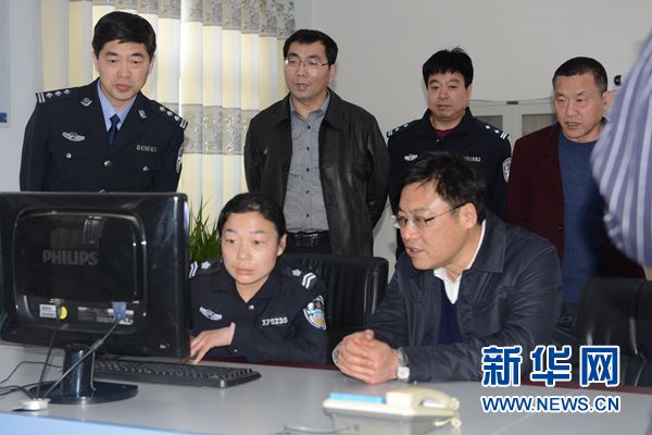 在河南省濮陽(yáng)市范縣高碼頭鎮(zhèn),邵景良(前右)在調(diào)研綜治和平安建設(shè)工作(2016年3月3日攝)。 新華社發(fā)