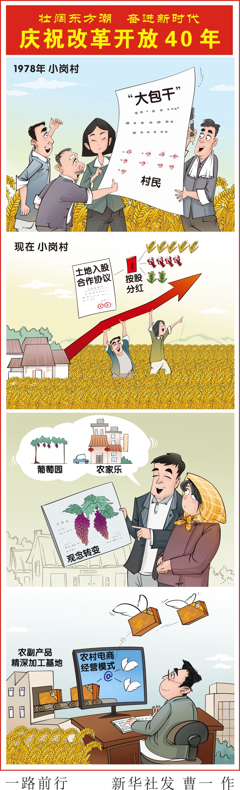 1978年的小崗村,18位村民按下了分田到戶的紅手印,“大包干”拉開了中國農(nóng)村改革的大幕。40年后的小崗村,正在開展農(nóng)村集體產(chǎn)權制度改革,土地入股讓農(nóng)民變股東;葡萄園里開起了農(nóng)家樂,對農(nóng)副產(chǎn)品進行精深加工,電商經(jīng)營模式助力產(chǎn)品打開銷路,觀念的轉變讓小崗村里的農(nóng)民不再僅僅種著一畝三分地。