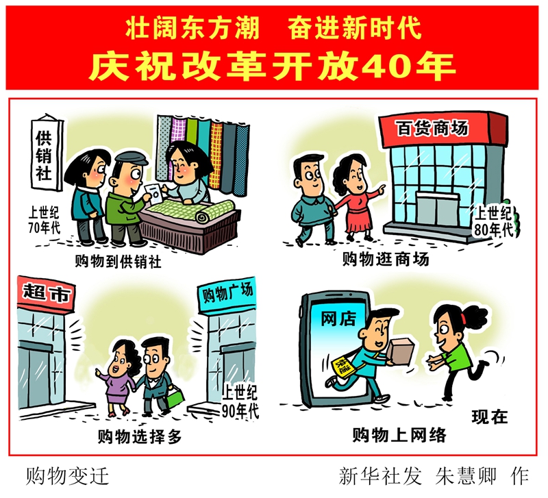 消費:上世紀70年代,購物到供銷社;上世紀80年代,購物逛商場;上世紀90年代,購物選擇多;如今,購物上網(wǎng)絡。↓↓