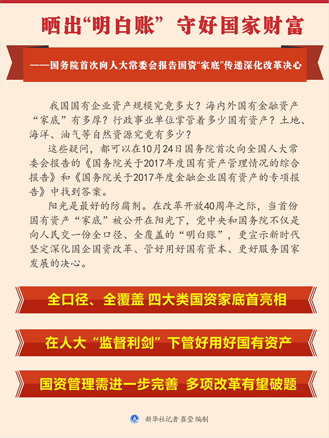 陽光是最好的防腐劑。在改革開放40周年之際,當首份國有資產(chǎn)“家底”被公開在陽光下,黨中央和國務(wù)院不僅是向人民交一份全口徑、全覆蓋的“明白賬”,更宣示新時代堅定深化國企國資改革、管好用好國有資本、更好服務(wù)國家發(fā)展的決心。