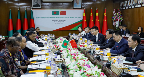 中國駐孟加拉國大使張佐,國務(wù)院副秘書長孟揚,公安部副部長、國家移民管理局局長許甘露,孟加拉國內(nèi)政部常秘烏丁、裘德瑞,警察總監(jiān)帕特瓦瑞參加會談。(圖:滿博)