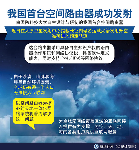 新華社長沙10月29日電(趙寶康、劉于藍(lán))由國防科技大學(xué)自主設(shè)計(jì)與研制的我國首臺空間路由器,近日在太原衛(wèi)星發(fā)射中心搭載長征四號乙運(yùn)載火箭發(fā)射升空,準(zhǔn)確進(jìn)入預(yù)定軌道。