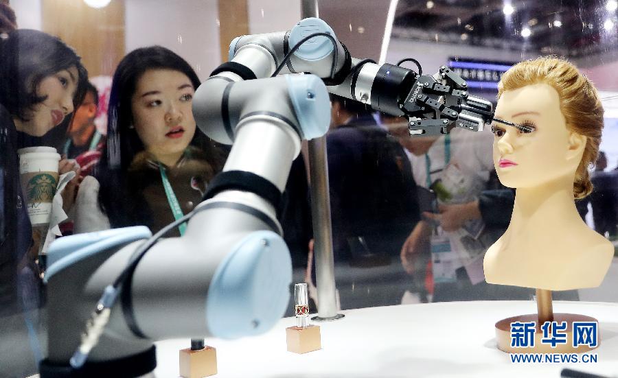 11月7日,參觀者在法國歐萊雅展臺觀看機器人作業(yè)演示。 休戚與共的地球村,共享創(chuàng)新成果已成為國際社會的共同意愿和現(xiàn)實選擇。透過進博會這個窗口可以看出,從上下游產(chǎn)業(yè)銜接到前沿領(lǐng)域合作,從協(xié)作共享資源到開放共享智慧,全球經(jīng)濟發(fā)展的新動能正在匯聚。 新華社記者 方喆 攝