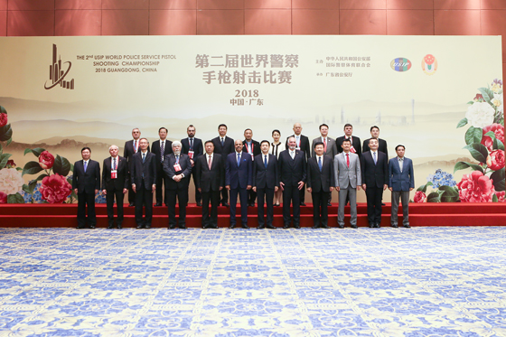 11月13日,公安部常務(wù)副部長(zhǎng)、第二屆世界警察手槍射擊比賽組委會(huì)名譽(yù)主席王小洪在廣州同來(lái)華出席比賽開(kāi)幕式的國(guó)際警察體育聯(lián)合會(huì)和各國(guó)執(zhí)法部門(mén)官員合影。
