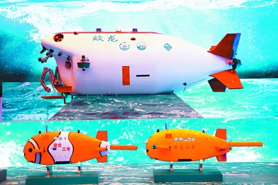 “可上九天攬?jiān)?,可下五洋捉鱉”。一邊是航天技術(shù)展區(qū),一邊是航海技術(shù)展區(qū),完美對(duì)應(yīng)著詩句,一上一下,延展著人類對(duì)于世界的認(rèn)知和想象。天宮二號(hào)空間實(shí)驗(yàn)室、嫦娥三號(hào)月球探測器以及蛟龍、海龍、潛龍“三龍兄弟”深海探測裝備模型,讓很多在場的孩子發(fā)出贊嘆之聲。