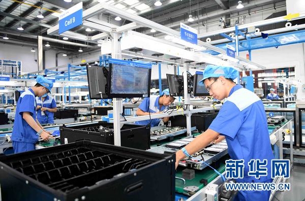 員工們?cè)诶顺备叨巳蒎e(cuò)計(jì)算機(jī)產(chǎn)業(yè)基地生產(chǎn)線上工作(6月14日攝)。 新華社記者 朱崢攝
