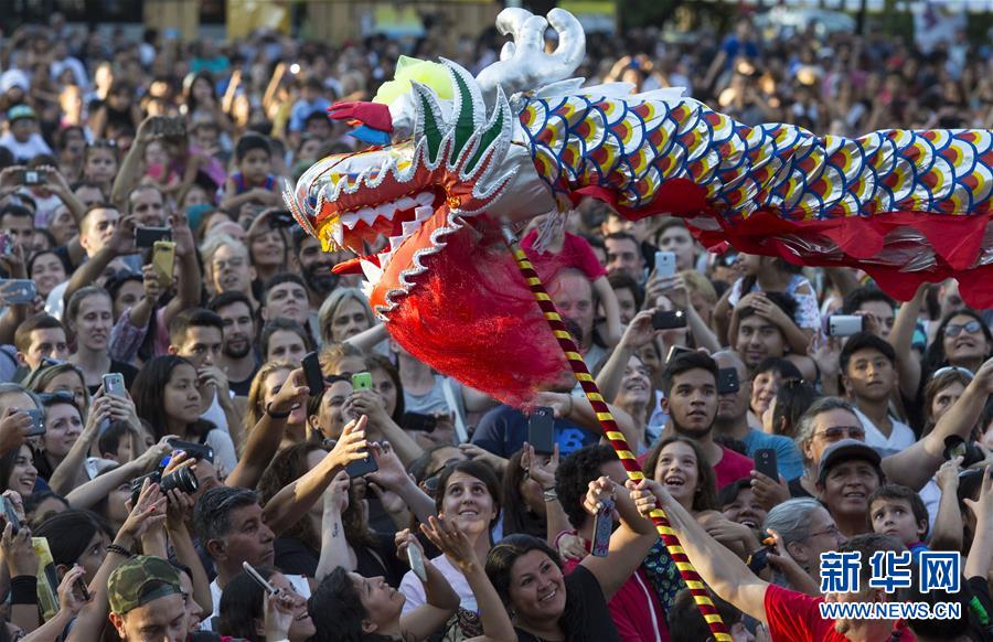 2018年2月10日,在阿根廷布宜諾斯艾利斯舉行的中國(guó)春節(jié)廟會(huì)上,觀眾拍攝舞龍。新華社發(fā)(馬丁·薩巴拉 攝)