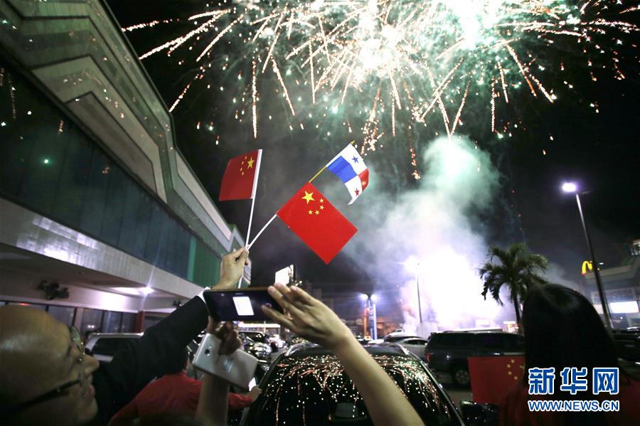2017年6月12日,在巴拿馬首都巴拿馬城的華人社區(qū),人們?cè)诎湍民R與中國(guó)建交的慶?;顒?dòng)上拍攝煙花。新華社發(fā)(毛里西奧·巴倫蘇埃拉 攝)