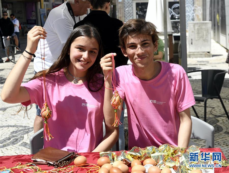 2018年6月16日,在葡萄牙阿威羅舉行的端午龍舟巡游活動(dòng)開(kāi)幕式上,阿威羅大學(xué)孔子學(xué)院的學(xué)生展示他們制作的蛋袋。新華社記者 張立云 攝