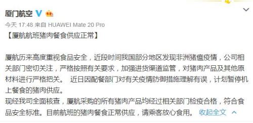 廈門航空24日在官方微博發(fā)布消息稱,廈航航班豬肉餐食供應正常,其采購的所有豬肉產(chǎn)品均經(jīng)過相關部門檢疫合格,符合食品安全標準。