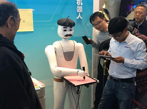 智能畫像機器人“大千”在為一名觀眾畫頭像
