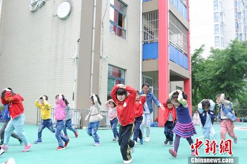 資料圖:幼兒園小朋友在進(jìn)行地震逃生模擬演習(xí)。中新社記者 張婭子 攝