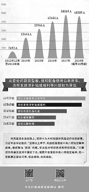 六年來(lái),中央紀(jì)委國(guó)家監(jiān)委和各級(jí)紀(jì)檢監(jiān)察機(jī)關(guān)以釘釘子精神打好作風(fēng)建設(shè)持久戰(zhàn),一個(gè)節(jié)點(diǎn)一個(gè)節(jié)點(diǎn)堅(jiān)守,一個(gè)問(wèn)題一個(gè)問(wèn)題解決,盯緊盯牢、持之以恒,一刻不停歇地推動(dòng)作風(fēng)建設(shè)向縱深發(fā)展,以實(shí)際成效將“金色名片”越擦越亮。截至2018年10月底,全國(guó)累計(jì)查處違反中央八項(xiàng)規(guī)定精神問(wèn)題254808起,處理349552人,給予黨紀(jì)政務(wù)處分206428人。