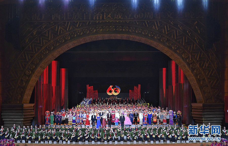 12月9日,慶祝廣西壯族自治區(qū)成立60周年文藝晚會(huì)《壯志飛揚(yáng)》在廣西文化藝術(shù)中心精彩上演。中共中央政治局常委、全國(guó)政協(xié)主席、中央代表團(tuán)團(tuán)長(zhǎng)汪洋和各族各界干部群眾等近900人觀看演出。 新華社記者 申宏 攝
