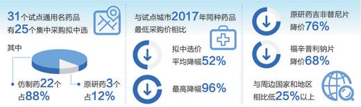 擬中選結(jié)果顯示,31個(gè)試點(diǎn)通用名藥品有25個(gè)集中采購(gòu)擬中選,成功率81%。其中,通過(guò)一致性評(píng)價(jià)的仿制藥22個(gè),占88%,原研藥3個(gè),占12%。與試點(diǎn)城市去年同種藥品最低采購(gòu)價(jià)相比,擬中選價(jià)平均降幅52%,最高降幅96%。原研藥吉非替尼片降價(jià)76%,福辛普利鈉片降價(jià)68%,與周邊國(guó)家和地區(qū)相比低25%以上。