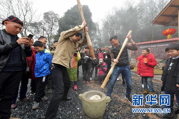 在江西宜春溫湯鎮(zhèn)水口村,游客體驗傳統(tǒng)的打糍粑(3月2日攝)。? 新華社記者 彭昭之 攝