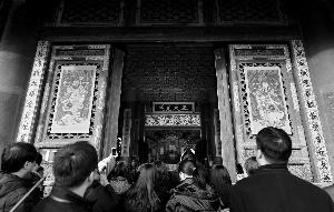 此次展覽從臘月初一展至三月初三,為期三個月,分為文物展覽和實景體驗兩部分。文物展覽位于午門正殿和東西雁翅樓展廳,共展出文物885件(套)。實景體驗部分包括整個紫禁城開放區(qū)域,都成為春節(jié)文化的展場,在宮殿門口會懸掛著寓意吉祥的春聯(lián)、門神(上圖),在廊廡下裝飾著華美的宮燈,在乾清宮的丹陛上下豎立著高大的天燈、萬壽燈,總共使用仿制品超過1000件。