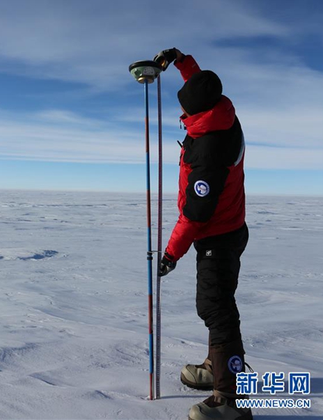 中國(guó)第35次南極科考隊(duì)隊(duì)員、武漢大學(xué)中國(guó)南極測(cè)繪研究中心的楊元德在測(cè)量冰流速(12月22日攝)。新華社記者 劉詩(shī)平 攝