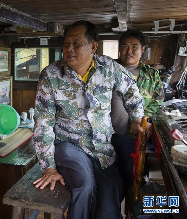 11月14日,在海南省瓊海市潭門鎮(zhèn),王書茂(左)在漁船上。 新華社發(fā)(宋國強 攝)