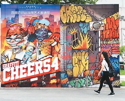 圖為游客走過(guò)青島紡織谷涂鴉宣傳畫前。 王海濱攝(人民視覺(jué))