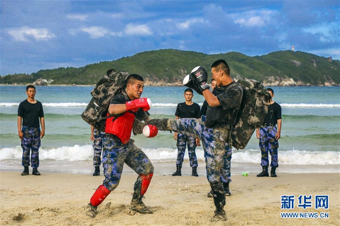 海軍陸戰(zhàn)隊(duì)某旅偵察營(yíng)在三亞某海域組織特戰(zhàn)隊(duì)員進(jìn)行沙灘格斗訓(xùn)練(11月21日攝)。新華社發(fā)(范旭東 攝)