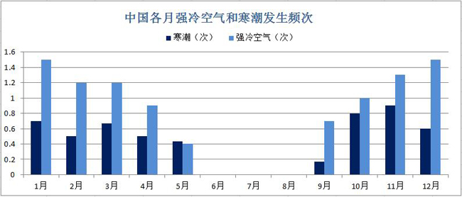 中國(guó)各月強(qiáng)冷空氣和寒潮發(fā)生頻次 圖片數(shù)據(jù)來(lái)源:國(guó)家氣候中心