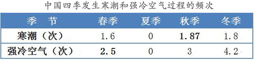 中國(guó)四季發(fā)生寒潮和強(qiáng)冷空氣過(guò)程的頻次 圖片數(shù)據(jù)來(lái)源:國(guó)家氣候中心