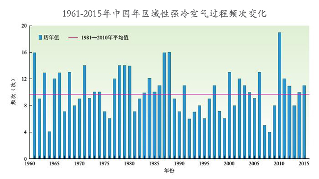 1961-2015年中國(guó)年區(qū)域性寒潮過(guò)程頻次變化 圖片數(shù)據(jù)來(lái)源:國(guó)家氣候中心