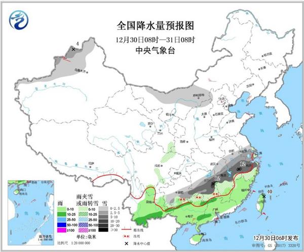 中央氣象臺預(yù)計,今天內(nèi)蒙古西部、新疆北部、江淮中南部、江漢東部、江南中北部、西南地區(qū)東南部等地部分地區(qū)有小到中雪或雨夾雪,其中,貴州東南部、湖南中部、江西北部、安徽南部、浙江中北部等地有大雪,湖南東部、江西西部和東北部、安徽南部、浙江西部等地局地有暴雪(10~12毫米)。江南南部、西南地區(qū)南部、華南大部和臺灣島大部等地部分地區(qū)有小到中雨,其中,臺灣島東北部局地有大雨(25~40毫米)。