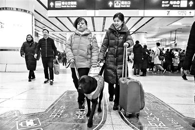 從北京南站站臺到地下停車場的路上,黑萌萌要經(jīng)過電梯,繞過障礙物。第一次看到火車站川流不息的人群,黑萌萌剛開始有些無所適從,在南站潤秋服務組張潤秋的幫助和陳燕不斷發(fā)出的“good good”的鼓勵下,它很快適應了新環(huán)境。張潤秋說,以前珍妮和陳燕來北京南站乘坐高鐵,服務組的工作人員都會接送,和她們成了好朋友,現(xiàn)在黑萌萌接班,相信它也一定能當好陳燕的眼睛。(記者 王薇)
