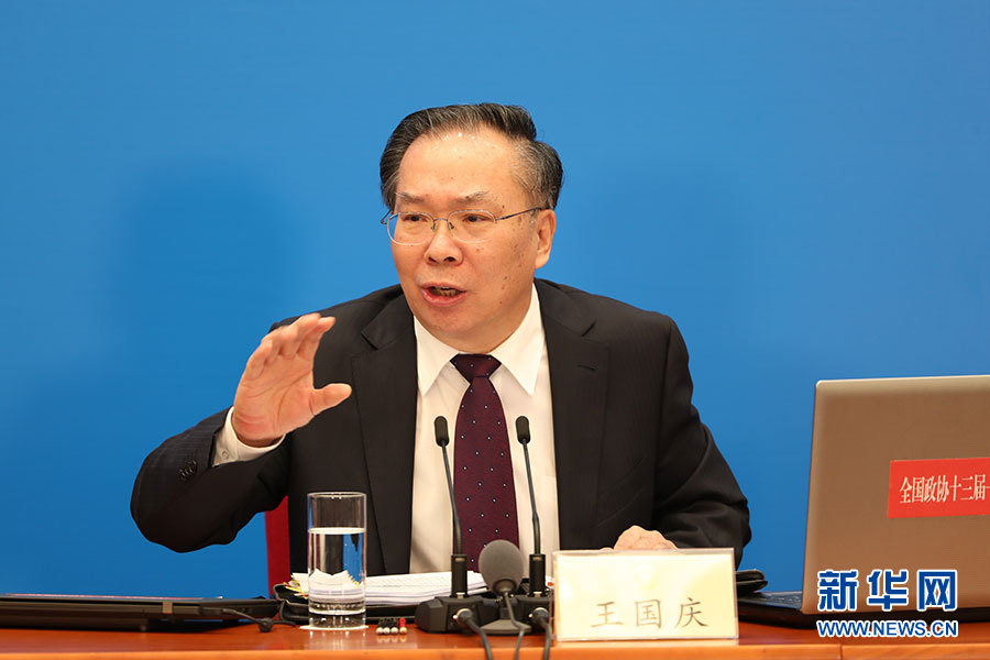 全國(guó)政協(xié)十三屆一次會(huì)議新聞發(fā)布會(huì)3月2日16:30在人民大會(huì)堂一層新聞發(fā)布廳召開(kāi),大會(huì)新聞發(fā)言人王國(guó)慶向中外媒體介紹本次大會(huì)有關(guān)情況并回答記者提問(wèn)。圖為大會(huì)新聞發(fā)言人王國(guó)慶回答記者提問(wèn)。?新華網(wǎng)/中國(guó)政府網(wǎng) 陳杰 攝