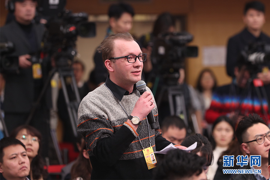 十三屆全國人大一次會議新聞中心于3月7日在梅地亞中心多功能廳舉行記者會,邀請國務院扶貧辦主任劉永富就“打好精準脫貧攻堅戰(zhàn)”的相關問題回答中外記者的提問。圖為中俄頭條記者提問。新華網(wǎng)/中國政府網(wǎng) 曲植 攝