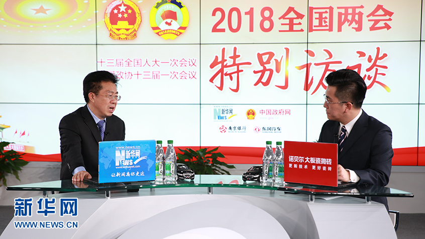 全國(guó)人大代表、中國(guó)人民銀行鄭州中心支行行長(zhǎng)徐諾金(左)做客新華網(wǎng)2018全國(guó)兩會(huì)特別訪談。新華網(wǎng)楊锘攝