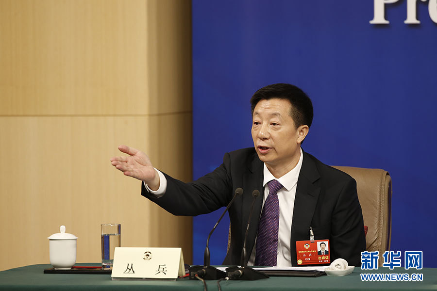 3月10日8時45分,全國政協(xié)十三屆一次會議在梅地亞中心多功能廳舉行記者會,邀請5位全國政協(xié)委員就“提高保障和改善民生水平”回答記者提問。圖為記者會主持人叢兵。新華網(wǎng)/中國政府網(wǎng) 翟子赫 攝