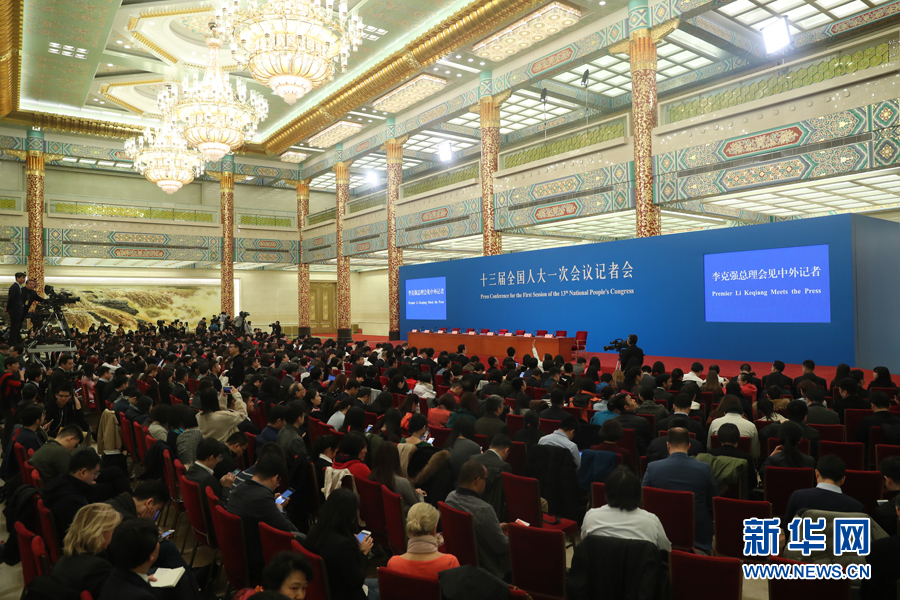 3月20日上午,十三屆全國人大一次會(huì)議閉幕后,國務(wù)院總理李克強(qiáng)在人民大會(huì)堂三樓金色大廳會(huì)見采訪十三屆全國人大一次會(huì)議的中外記者并回答記者提出的問題。圖為記者會(huì)現(xiàn)場(chǎng)。 新華網(wǎng)/中國政府網(wǎng) 翟子赫 攝