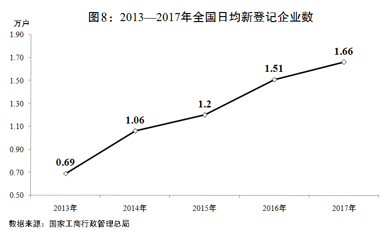 二是大眾創(chuàng)業(yè)萬(wàn)眾創(chuàng)新不斷深化。《國(guó)務(wù)院關(guān)于強(qiáng)化實(shí)施創(chuàng)新驅(qū)動(dòng)發(fā)展戰(zhàn)略進(jìn)一步推進(jìn)大眾創(chuàng)業(yè)萬(wàn)眾創(chuàng)新深入發(fā)展的意見(jiàn)》(國(guó)發(fā)〔2017〕37號(hào))印發(fā)實(shí)施。新支持92個(gè)國(guó)家雙創(chuàng)示范基地建設(shè),建成4298家眾創(chuàng)空間、3255家科技企業(yè)孵化器和400余家企業(yè)加速器,第三屆全國(guó)雙創(chuàng)活動(dòng)周及“創(chuàng)響中國(guó)”巡回接力活動(dòng)成功舉辦。全年新登記企業(yè)達(dá)到607.4萬(wàn)戶,增長(zhǎng)9.9%,日均新登記企業(yè)達(dá)到1.66萬(wàn)戶。