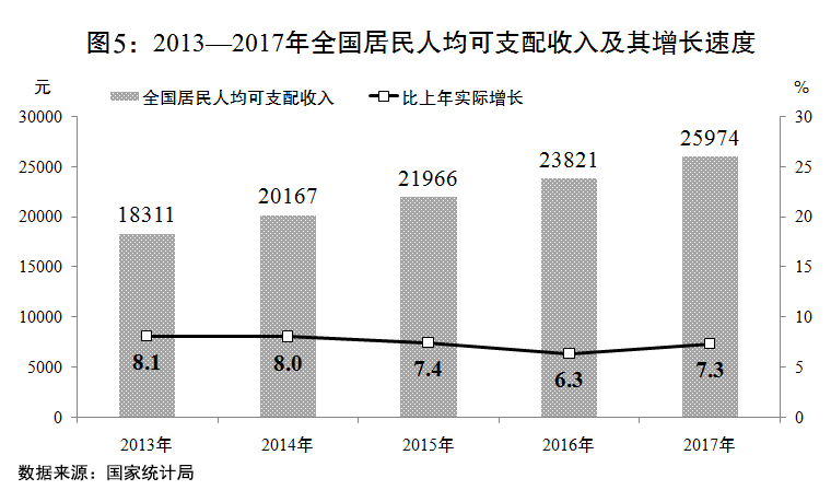 全國(guó)居民人均可支配收入達(dá)到25974元,實(shí)際增長(zhǎng)7.3%,高于國(guó)內(nèi)生產(chǎn)總值增速0.4個(gè)百分點(diǎn),農(nóng)村居民收入增長(zhǎng)繼續(xù)快于城鎮(zhèn)居民。