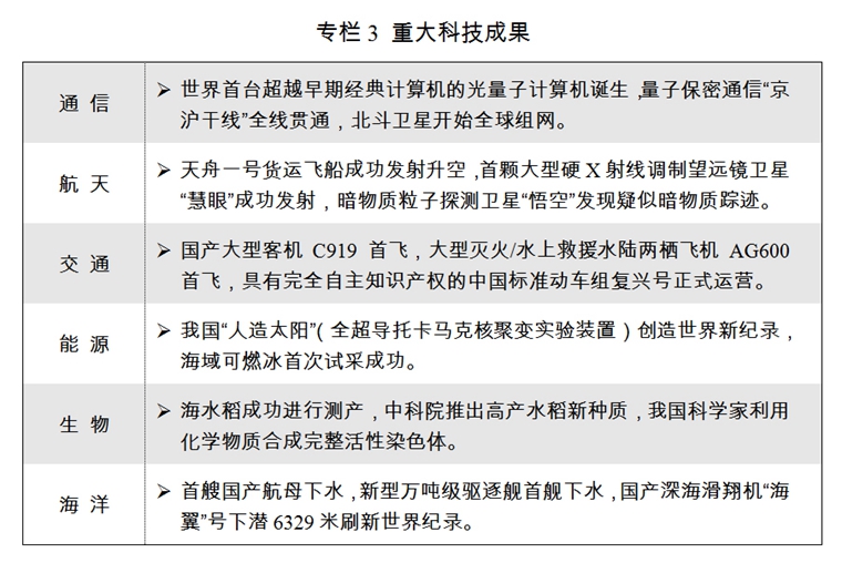 一批重大科技成果涌現(xiàn),“慧眼”衛(wèi)星成功發(fā)射運(yùn)行,C919大型客機(jī)首飛,量子計(jì)算機(jī)研制取得重大突破,首艘國(guó)產(chǎn)航母順利下水,海域可燃冰首次試采成功。全面創(chuàng)新改革試驗(yàn)深入推進(jìn),169項(xiàng)先行先試改革舉措全面啟動(dòng),其中13項(xiàng)改革舉措向全國(guó)推廣。北京、上??萍紕?chuàng)新中心,北京懷柔、上海張江、安徽合肥三個(gè)綜合性國(guó)家科學(xué)中心加快建設(shè)。國(guó)家實(shí)驗(yàn)室建設(shè)啟動(dòng),國(guó)家重大科技基礎(chǔ)設(shè)施建設(shè)持續(xù)推進(jìn)。國(guó)家科技重大專項(xiàng)加速攻堅(jiān),“科技創(chuàng)新2030-重大項(xiàng)目”啟動(dòng)實(shí)施。研發(fā)費(fèi)用加計(jì)扣除、股權(quán)激勵(lì)和技術(shù)入股所得稅優(yōu)惠政策、完善高新技術(shù)企業(yè)認(rèn)定辦法等進(jìn)一步落實(shí),17家國(guó)家自主創(chuàng)新示范區(qū)、156家國(guó)家高新區(qū)形成區(qū)域創(chuàng)新發(fā)展的核心載體和重要引擎。