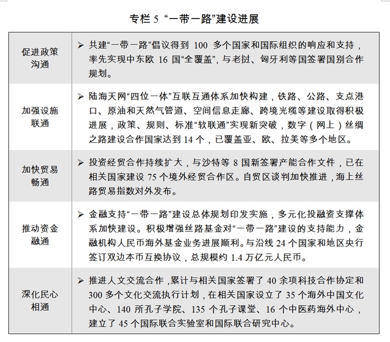 ?。┮浴耙粠б宦贰苯ㄔO(shè)為重點(diǎn),開(kāi)放型經(jīng)濟(jì)新體制穩(wěn)步健全。著力提高“引進(jìn)來(lái)”水平,持續(xù)改善“走出去”結(jié)構(gòu),更深層次更高水平的全方位開(kāi)放格局加快形成。