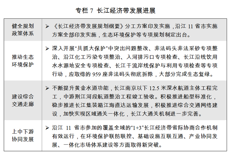 三是長(zhǎng)江經(jīng)濟(jì)帶發(fā)展取得積極進(jìn)展。全面落實(shí)《長(zhǎng)江經(jīng)濟(jì)帶發(fā)展規(guī)劃綱要》,省際合作協(xié)商機(jī)制有效運(yùn)行,“共抓大保護(hù)”格局初步形成。非法碼頭非法采砂整治、飲用水水源地安全檢查等專項(xiàng)行動(dòng)深入開(kāi)展,負(fù)面清單、跨界斷面考核等生態(tài)環(huán)保制度建設(shè)加快推進(jìn),水環(huán)境治理、水生態(tài)修復(fù)和水資源保護(hù)等重大工程大力實(shí)施。綜合立體交通走廊加快建設(shè),上海、武漢、重慶三大航運(yùn)中心建設(shè)進(jìn)展順利,滬蓉、滬渝、滬昆高速公路全線通車(chē)。
