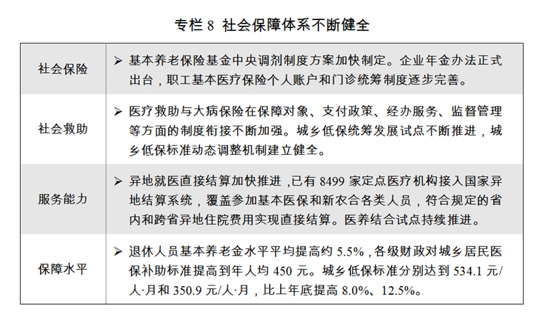 二是社會(huì)保障體系不斷健全。養(yǎng)老保險(xiǎn)制度頂層設(shè)計(jì)取得關(guān)鍵性進(jìn)展,劃轉(zhuǎn)部分國(guó)有資本充實(shí)社?;饘?shí)施方案印發(fā)實(shí)施。城鄉(xiāng)居民基本醫(yī)療保險(xiǎn)制度整合深入推進(jìn),異地就醫(yī)直接結(jié)算取得重要突破,所有省級(jí)異地就醫(yī)結(jié)算系統(tǒng)、所有統(tǒng)籌地區(qū)均與國(guó)家異地就醫(yī)結(jié)算系統(tǒng)實(shí)現(xiàn)對(duì)接。高齡津貼制度已在全國(guó)31個(gè)省份和新疆生產(chǎn)建設(shè)兵團(tuán)實(shí)現(xiàn)全覆蓋。城鎮(zhèn)職工基本養(yǎng)老和城鄉(xiāng)居民養(yǎng)老保險(xiǎn)參保人數(shù)分別達(dá)到4.02億人和5.13億人。城鎮(zhèn)棚戶區(qū)住房改造開(kāi)工609萬(wàn)套。