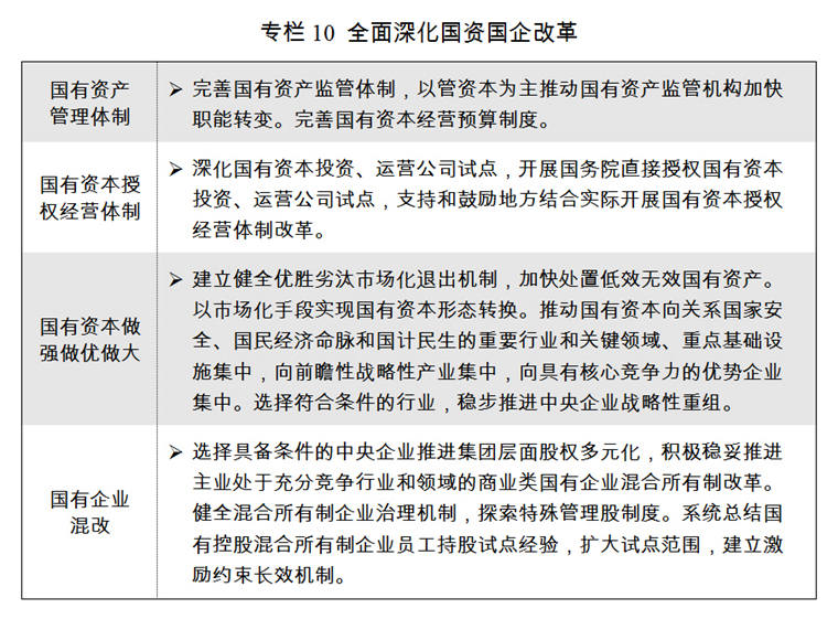 五是深化國(guó)資國(guó)企改革。完善各類國(guó)有資產(chǎn)管理體制,以管資本為主加快轉(zhuǎn)變國(guó)有資產(chǎn)監(jiān)管機(jī)構(gòu)職能,改革國(guó)有資本授權(quán)經(jīng)營(yíng)體制。加快國(guó)有經(jīng)濟(jì)布局優(yōu)化、結(jié)構(gòu)調(diào)整、戰(zhàn)略性重組,以資本為紐帶促進(jìn)各類所有制企業(yè)優(yōu)勢(shì)互補(bǔ),推動(dòng)國(guó)有資本做強(qiáng)做優(yōu)做大。積極穩(wěn)妥推進(jìn)國(guó)有企業(yè)股權(quán)多元化和混合所有制改革,進(jìn)一步推動(dòng)重點(diǎn)領(lǐng)域混合所有制改革試點(diǎn),培育具有全球競(jìng)爭(zhēng)力的世界一流企業(yè)。深化國(guó)有林區(qū)林場(chǎng)、農(nóng)墾改革。